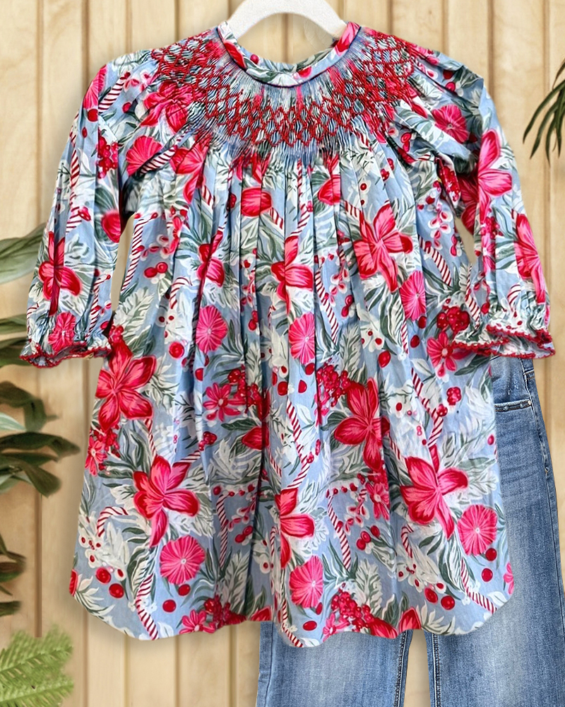 Floral Print Round Neck Rocking Smocked T-Shirt