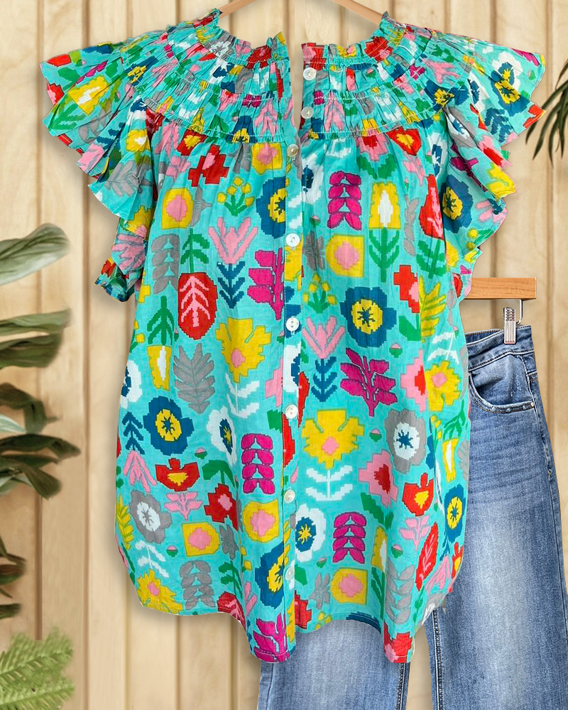 Floral Print Shirring Sweet Ruffle Sleeve T-Shirt