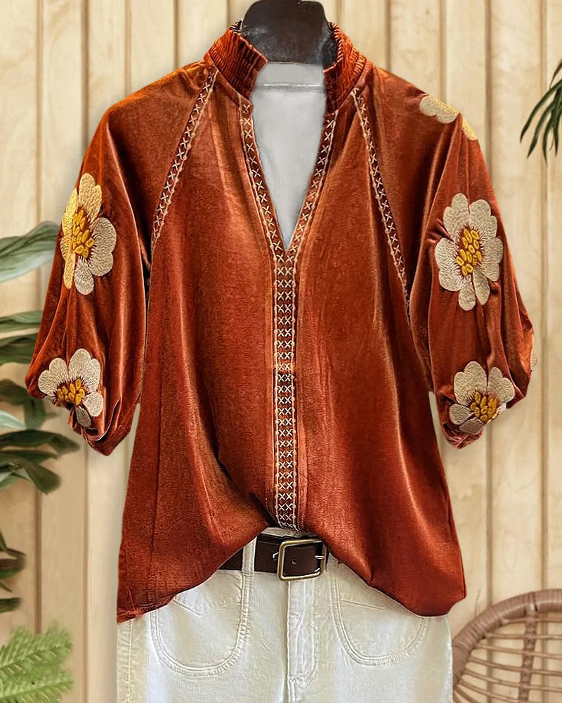 Floral Print Velvet Elegant Puff Sleeve T-Shirt