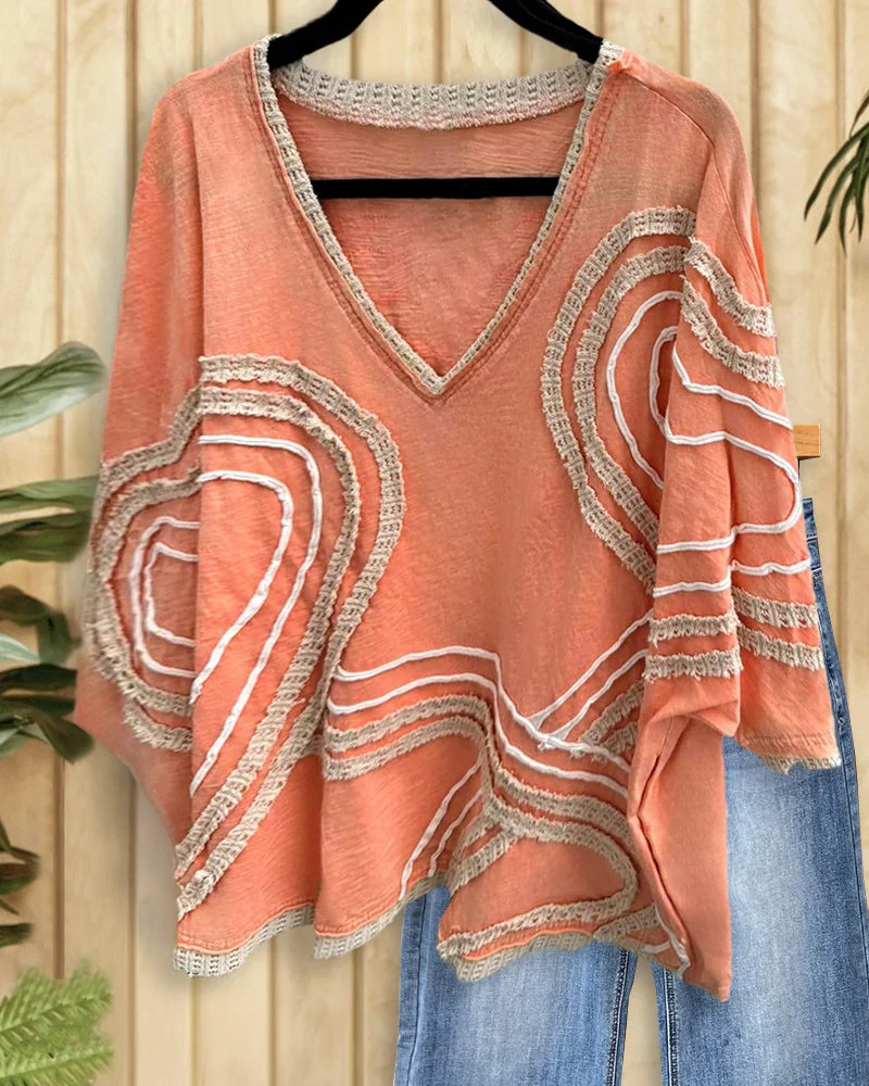 Oversized batwing sleeve T-shirt with heart applique, perfect for a comfortable and stylish look with a touch of love.
