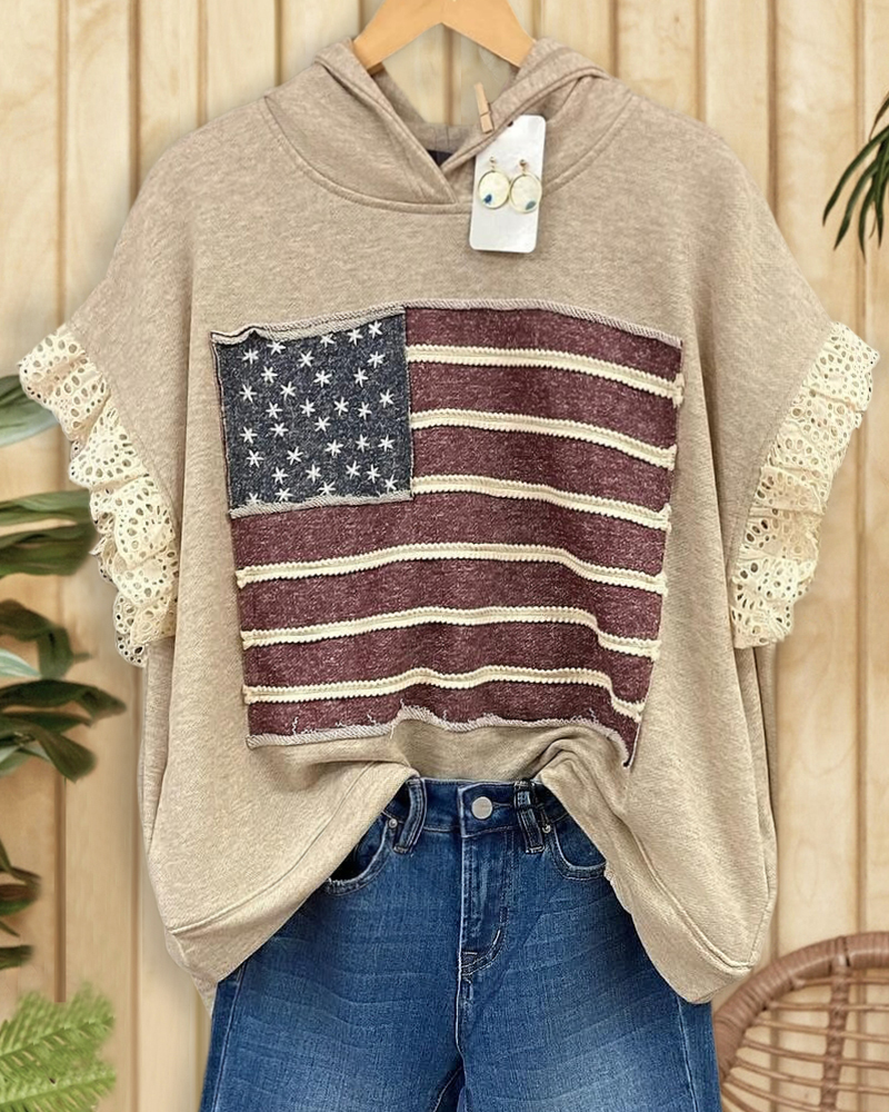 Show your patriotism in style with this flag-print hoodie tee, featuring delicate lace trim for a trendy, feminine touch.