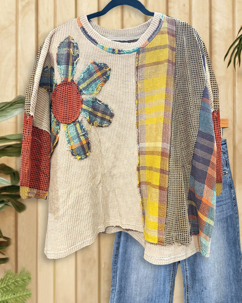 Stylish plaid waffle blouse with floral patches, perfect for casual outings.