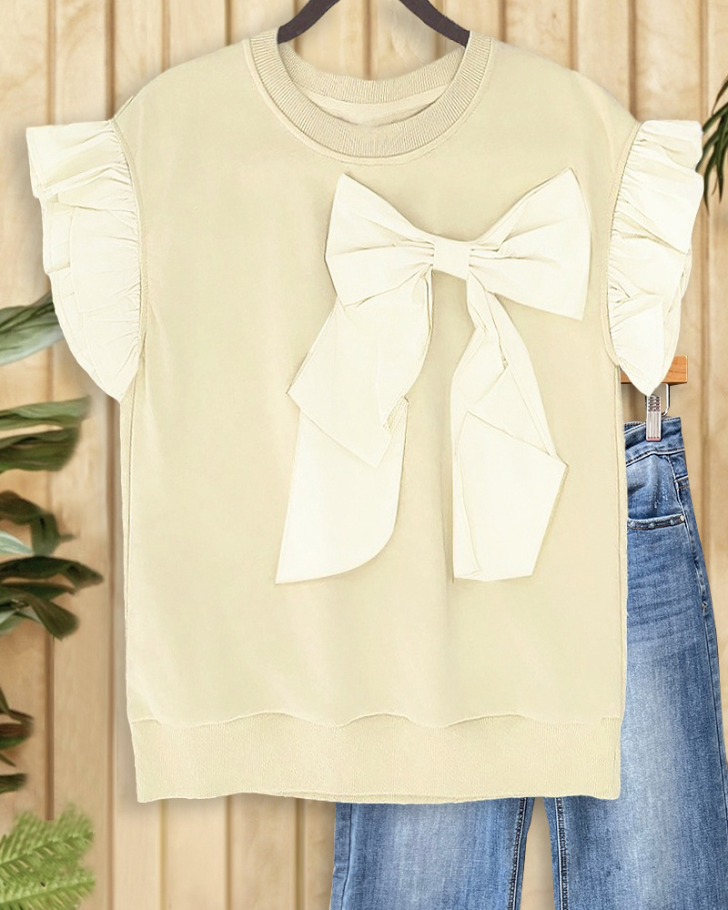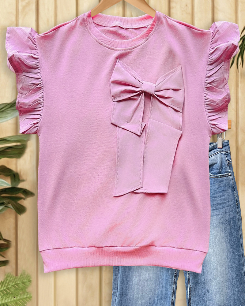 Playful ruffle sleeve t-shirt with bow decoration in solid color.