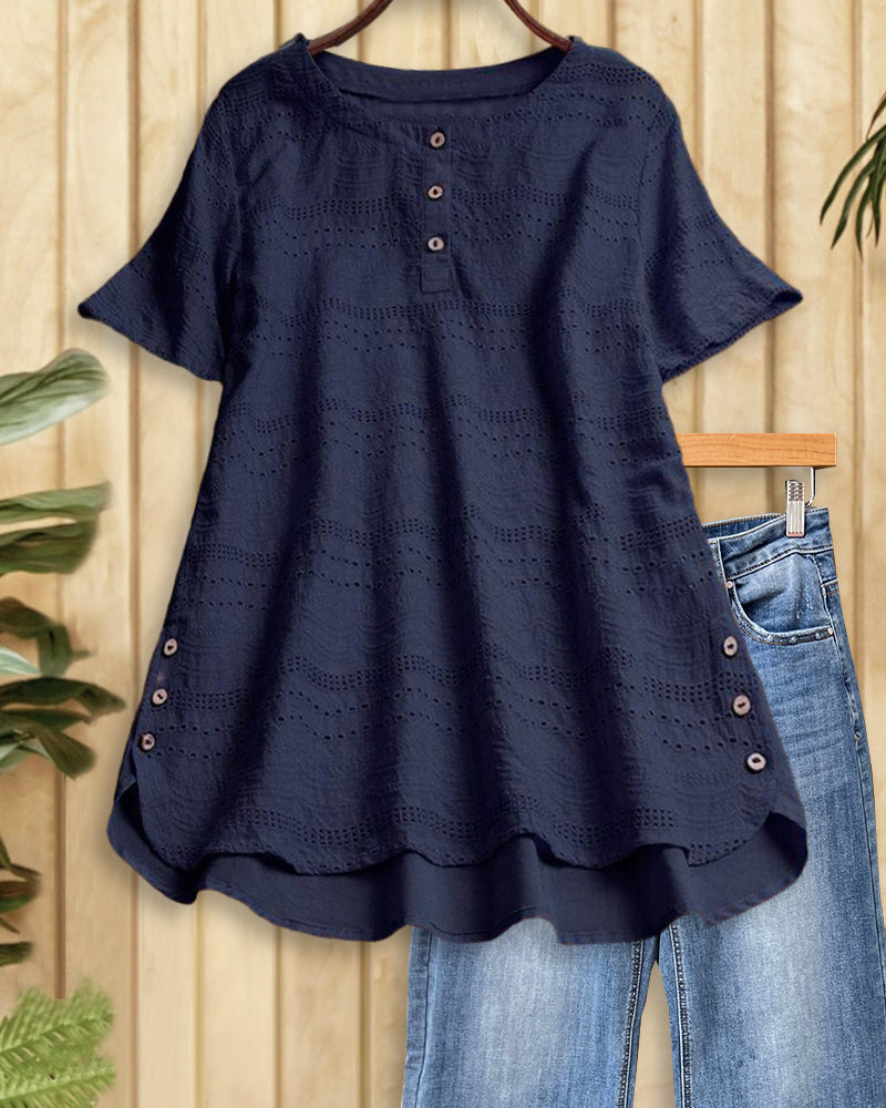 Solid Color Eyelets Classic Round Neck Button Blouse