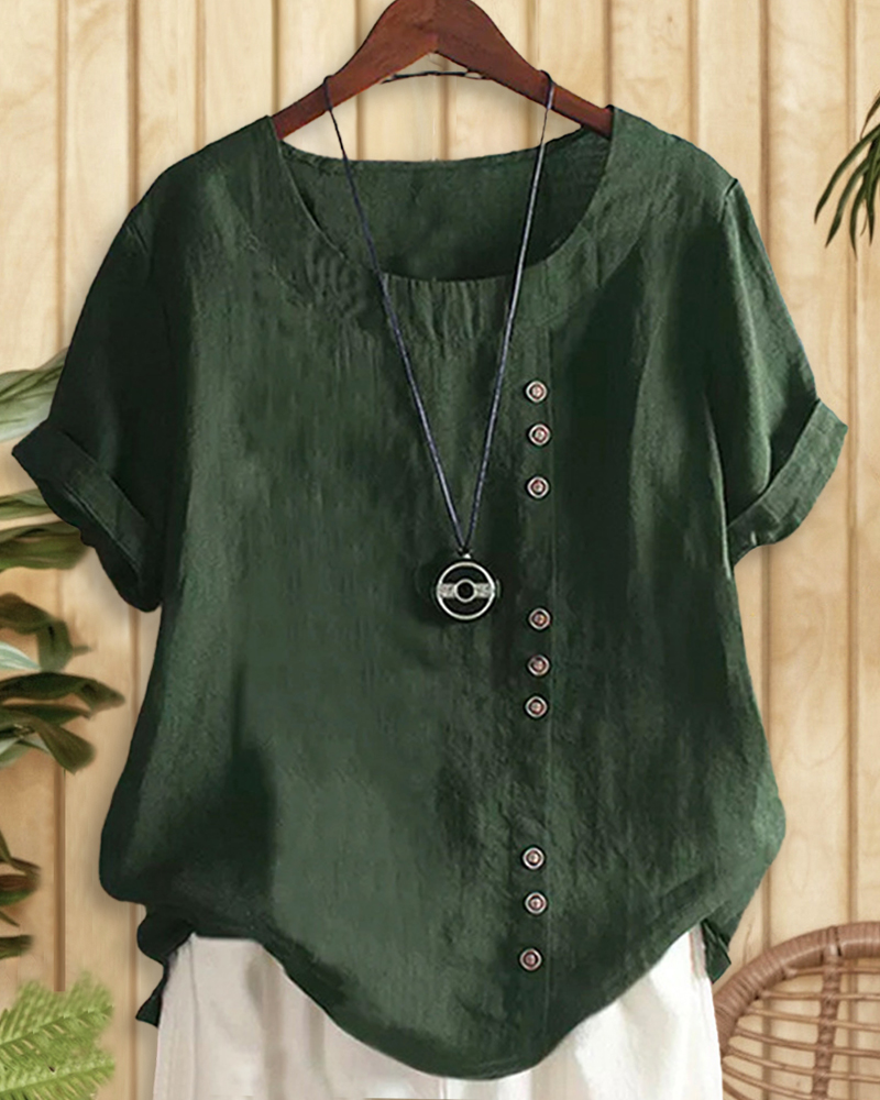Solid Color Scoop Neck Simple Button Decor T-Shirt