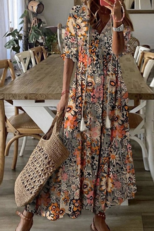 V Neck Short Sleeve Casual Floral Maxi Dress
