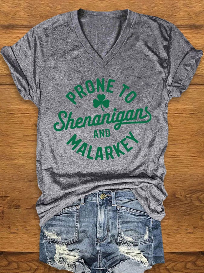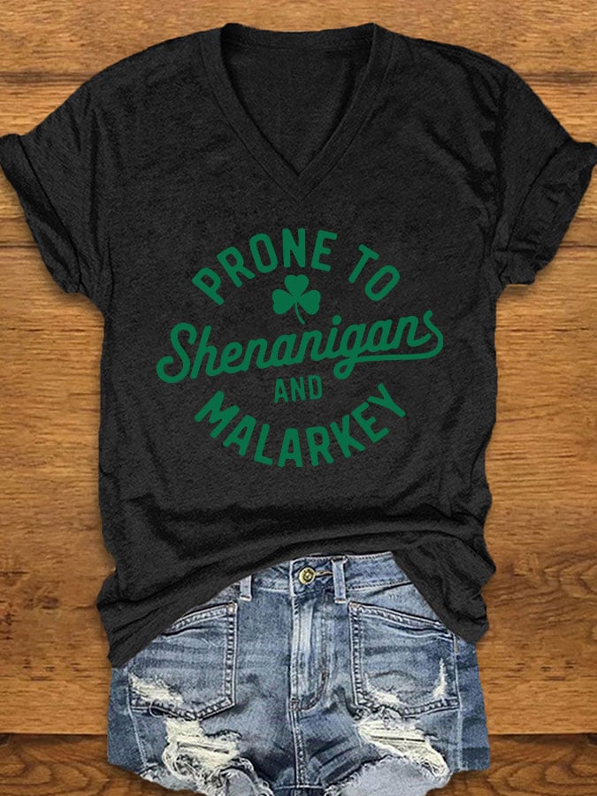 Women's St. Patrick's Day "Prone to Shenanigans and Malarkey" Print V-Neck T-Shirt
